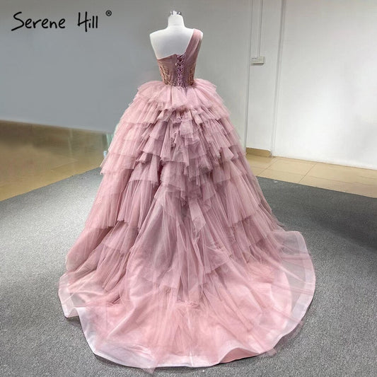 Pink One Shoulder Mermaid Sexy Evening Dresses 2025 Lace Pearls Sequins Elegant Formal Dress LA70386