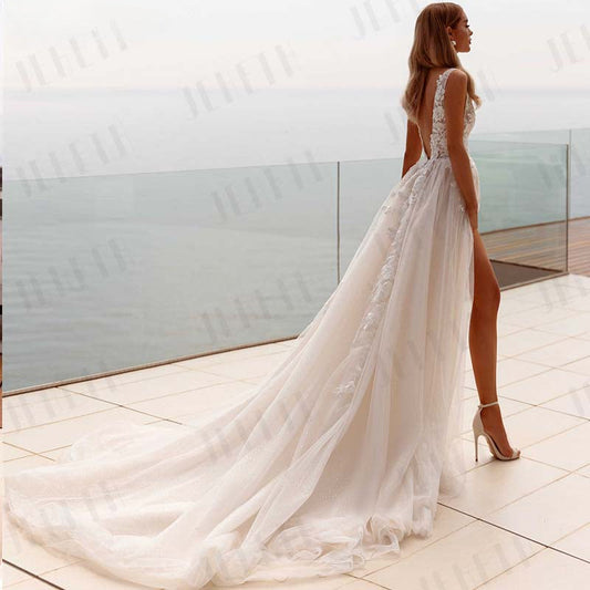 Popular V-neck Lace Applique A Line Wedding Dresses Backless Side Slit Custom Made Formal Bridal Grown 2025