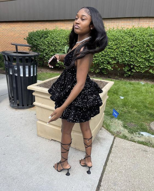 Sexy Black Sparkling Short Homecoming Dresses Back Open Tiered Sequin Graduation Gown Parties Night Y4111