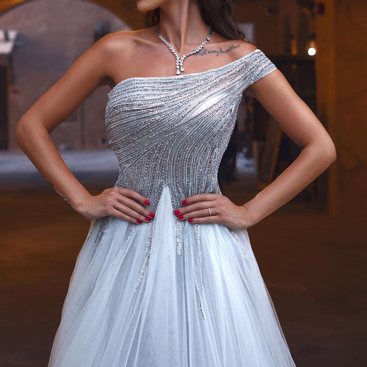 Silver A-Line One-Shoulder Evening Dresses Gowns 2025 Luxury Beaded For Women Party LA71672