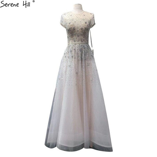 Silver A-Line Tulle Evening Dresses 2025 Dubai Short Sleeves Beading Formal Dress Design LA70715