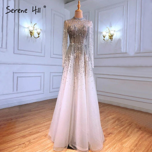 Silver Luxury Long Sleeves Dubai Evening Dresses 2025 A-Line Sequins Beading Sexy Formal Dress LA70418