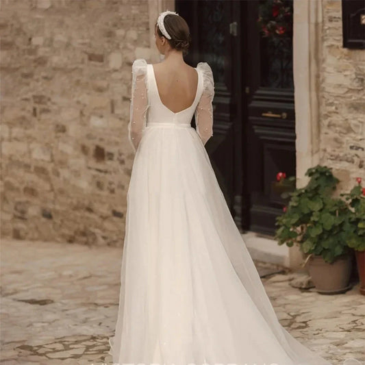 Simple Wedding Dresses A Line Long Illusion Sleeve Fuffy Tulle Ball Gowns Woman's Formal Bride Beach Party Vestidos Para Mujer
