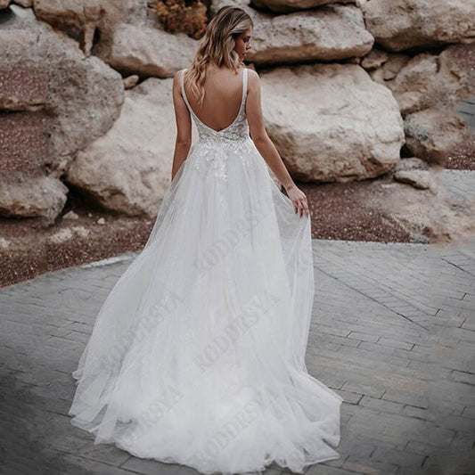 Sleeveless Appliques A-Line Bridal Gowns Backless Square Collar Wedding Dresses Spagehtti Straps Tulle Vestido De Novia