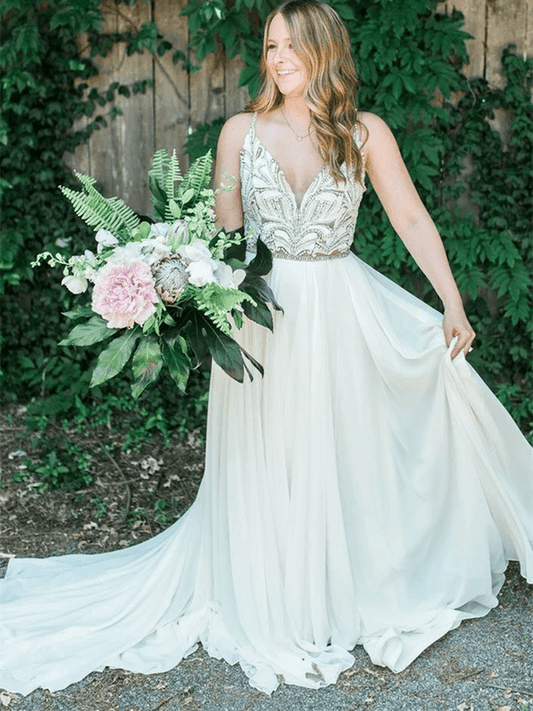 Spaghetti Straps Plunging V-Neck Wedding Dress Low Back Champagne Bridal Gown