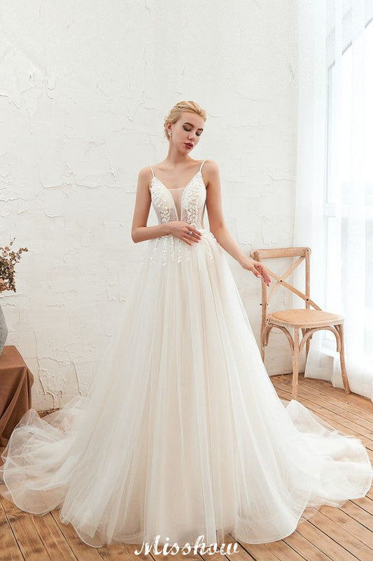 Spaghetti Straps Pretty Mermaid Appliqued V-neck Tulle Elegant Wedding Dresses