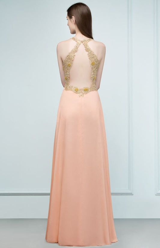 Spaghetti V-neck A-line Floor Length Appliqued Chiffon Bridesmaid Dresses