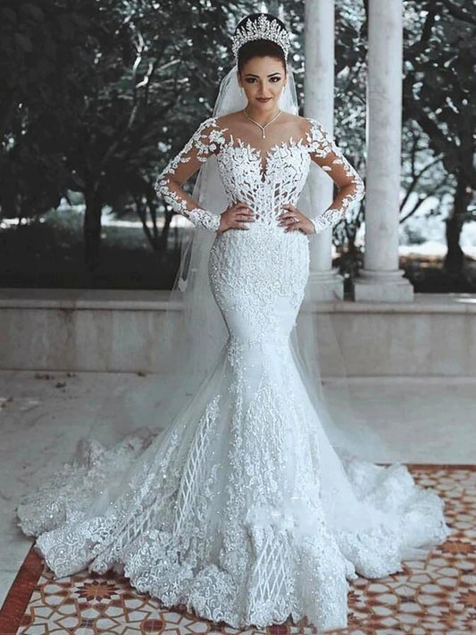 Sparkly Lace Wedding Dress Mermaid Illusion Bodice vestido de noiva Long Sleeve Sheer Neck Appliques Bridal Gowns 2025 Spring