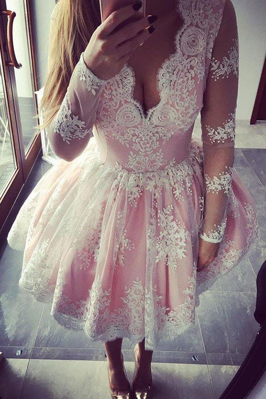 V-Neck Long Sleeves Short Pink Tulle Homecoming Dress with Appliques PG160