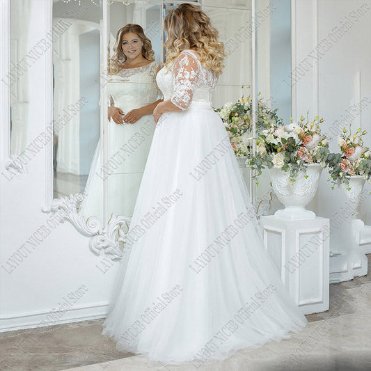Vintage Beach Wedding Dress Plus Size Boho Lace Applique Three Quarter Sleeves Tulle Bride Gown A-Line Floor Length