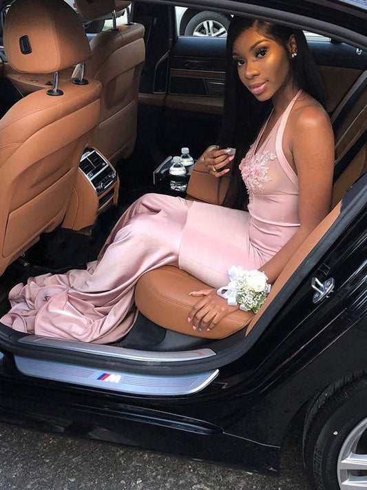 Gorgeous Mermaid Sleeveless Halter Applique Elastic Woven Satin Prom Dresses