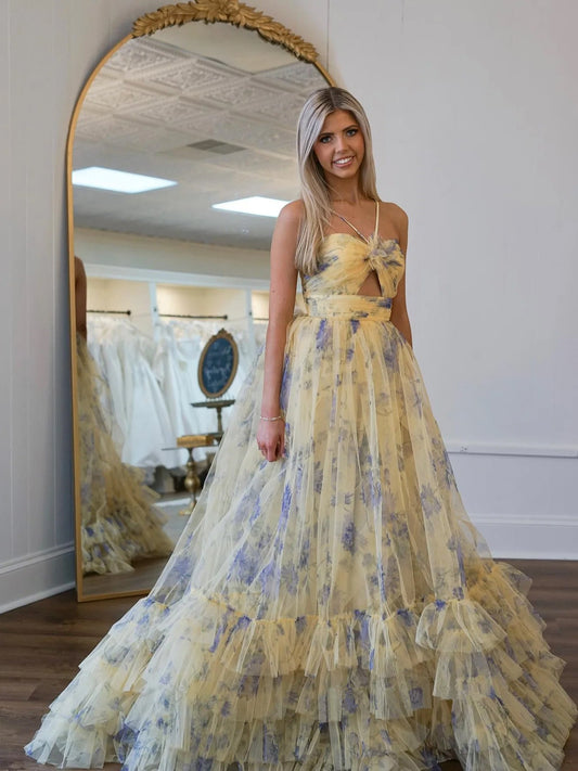 Straps Black Mesh Cutout Sequined Layered Long Prom Dress