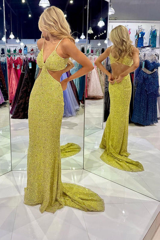 Mustard Green Sequins Deep V Neck Cutout Long Prom Dresses
