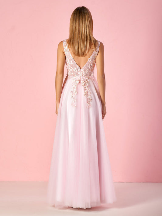 Elegant A-line V-Neck Tulle Floor-Length Prom Dress with Lace Appliques
