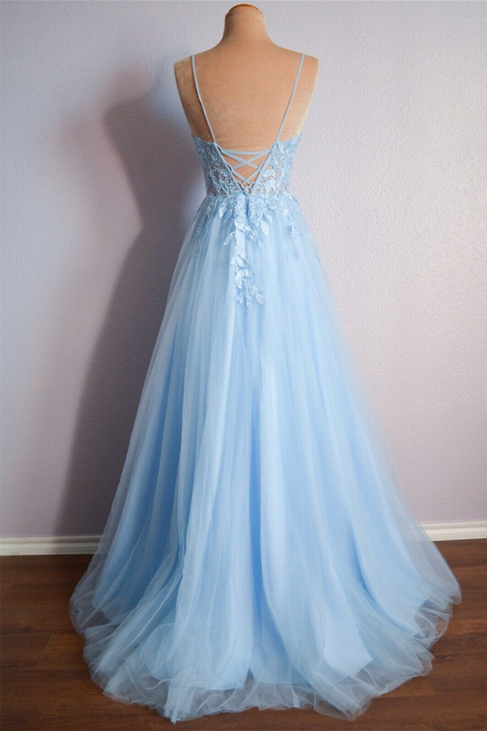 Light Blue V Neck Lace-Up Appliques Tulle Long Prom Dress