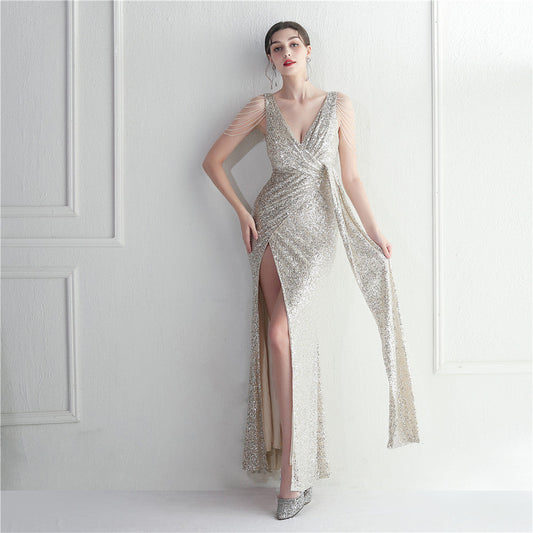 Sexy Sequin Sling Dress High Grade V Neck Slim Fit Women Evening Dress