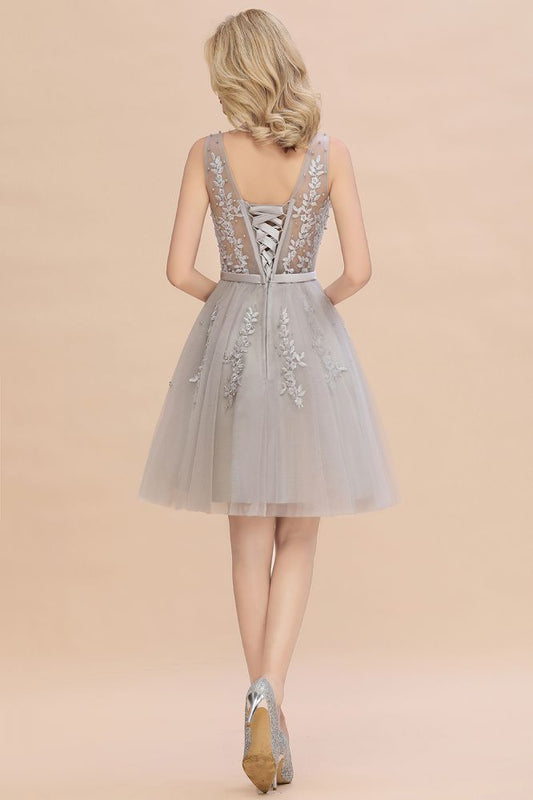 Charming V-Neck Tulle Lace Appliques Short Homecoming Dress Aline Backless Party Dress