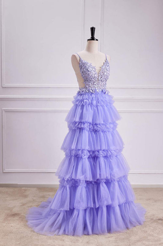 Lavender Plunging V Neck Floral Layers A-line Long Prom Dress