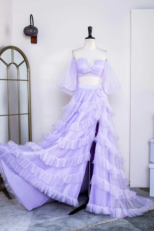 Two Piece Lavender Off the Shoulder Ruffles Prom Dress with Slit