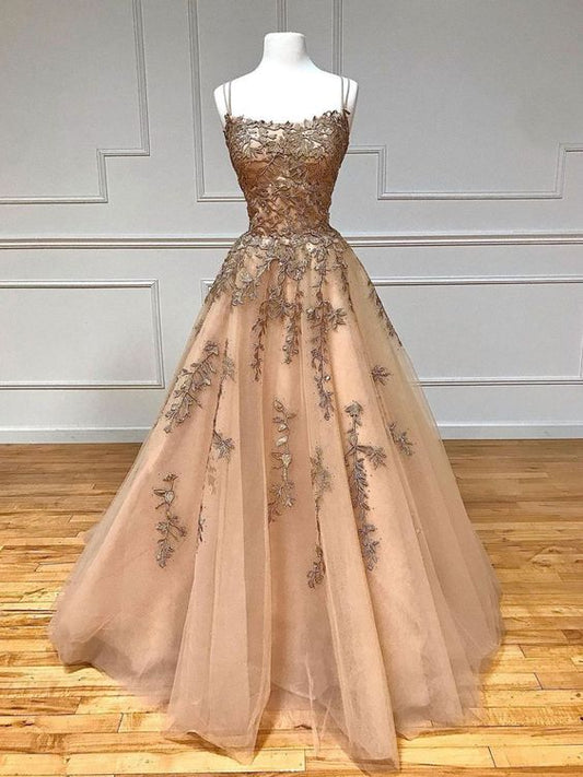 Champagne tulle lace long prom dress, champagne evening dress Y920