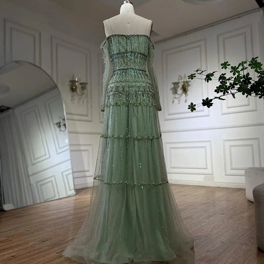Dubai Arabic Designer Luxury Sage Green A Line Beaded Evening Dresses Gowns For Women Wedding Party 2025 LA72342