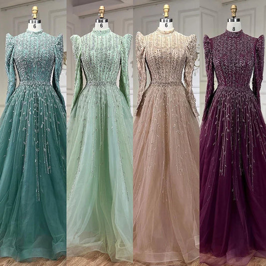 Dubai Arabic Green A Line Luxury Evening Dresses Gowns Beaded Long Sleeve For Women Wedding Party 2025 LA70271