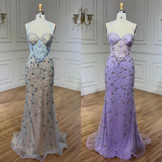 Dubai Blue Mermaid Luxury Beaded Spaghetti Strap Arabic Evening Dresses Gowns for Women Wedding Party 2025 LA72330