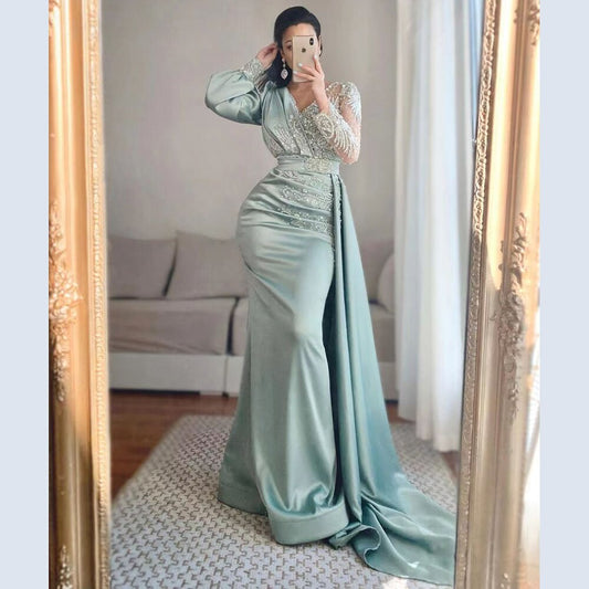 Muslim Mint Mermaid Elegant Beaded Satin Overskirt Evening Dresses Gowns Plus Size 2025 For Women Party LA71278