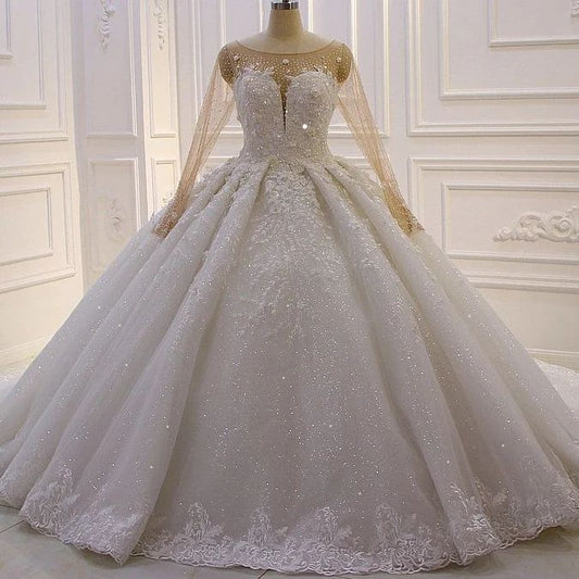 Luxurious A-line Lace Sequined Wedding Dress With Long Sleeves