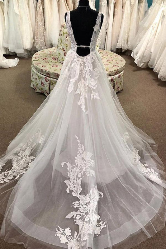 A-Linie Brautkleid mit Spitzenapplikationen, tiefem V-Ausschnitt und Hofschleppe, Hochzeitskleid WD465
