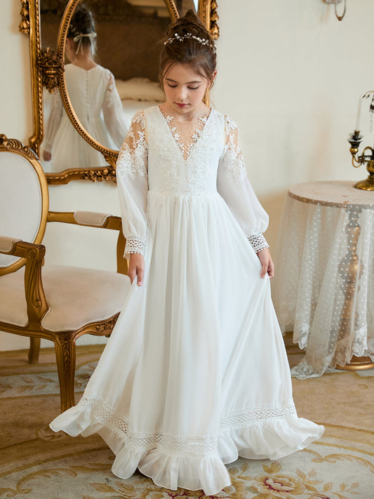 Bodenlanges Chiffon-Kleid in A-Linie und Elfenbein für die Erstkommunion