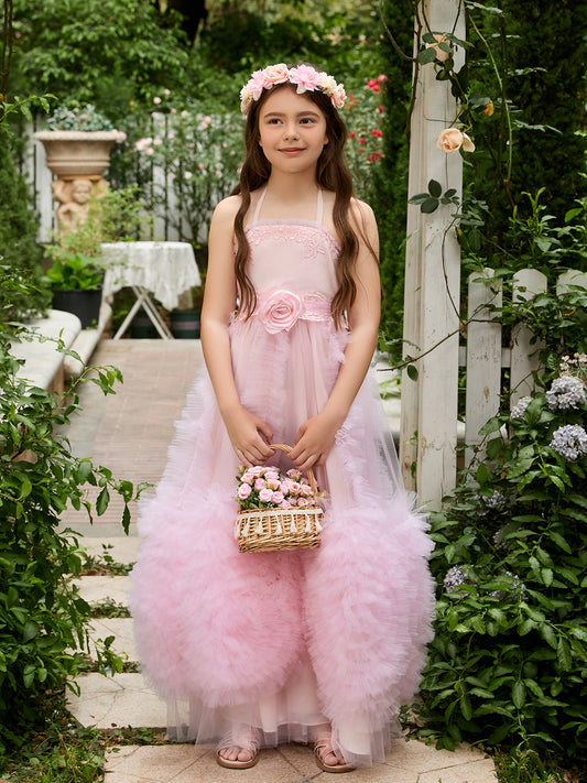 A-Linie Chiffon Bodenlang Rosa Blumenmädchenkleid
