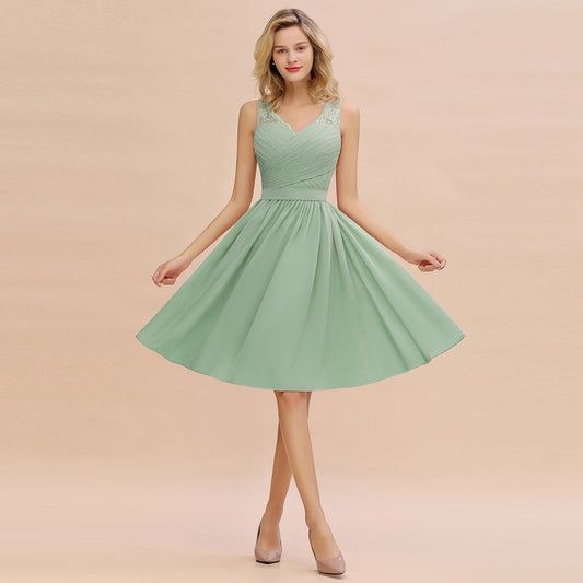Fabelhafte A-Linie V-Ausschnitt Ärmellos Satin Kurze Brautjungfernkleider
