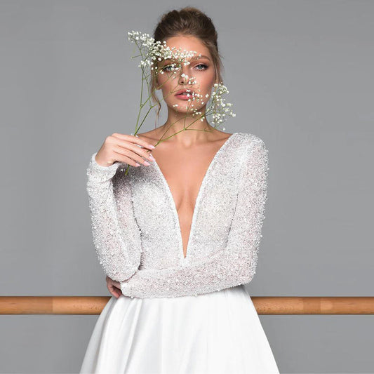 Luxuriöses Brautkleid im Prinzessinnen-Stil mit langen Ärmeln, tiefem V-Ausschnitt und Ballkleid für den Garten