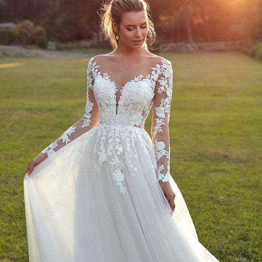 Pastrol Wedding Dresses For Woman Long Sleeves Illusion Back Scoop Bride Gowns Applique A-Line Tulle vestidos de novia