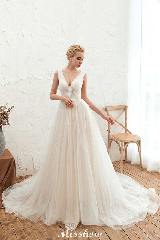 Sexy Prinzessinnen-Brautkleid aus Tüll mit V-Ausschnitt und Spitzenapplikationen