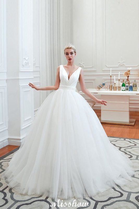 Sexy V-Ausschnitt Ärmelloses Prinzessin Frühlingshochzeitskleid | Weiße Brautkleider mit tiefem Rücken und Gürtel