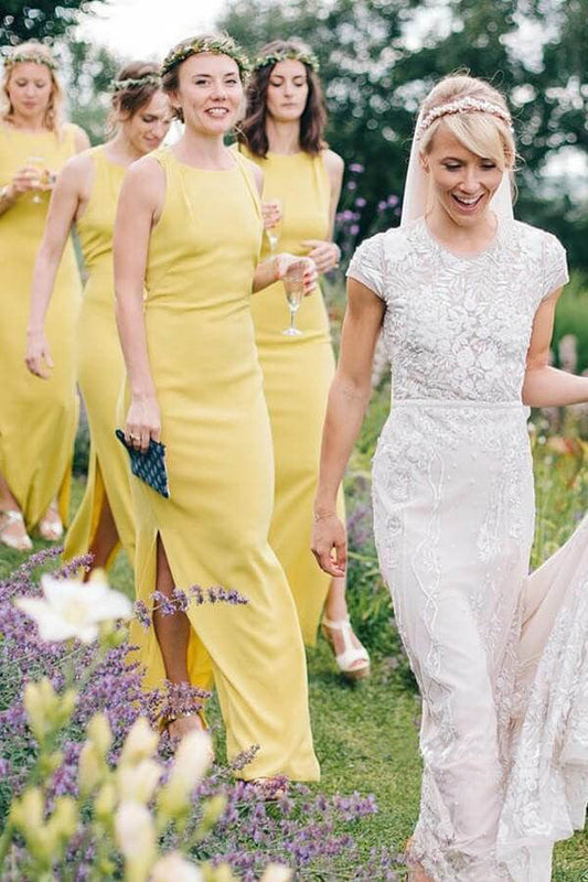 Bodenlanges, gelbes Brautjungfernkleid mit offenem Rücken und Schlitz BD140