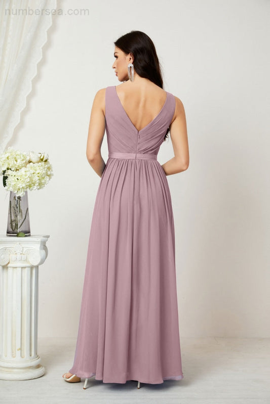 Damen Chiffon Langes Brautjungfernkleid A-Linie Ärmellos Formelles Ballkleid für Abendparty Homecoming Kleider 2808