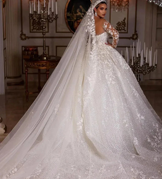 Luxus-Brautkleider aus Spitze für Damen, Dubai, lange Ärmel, Pailletten, Perlen, durchsichtiger Hals, Applikationen, Glitzer, Tüll, Brautkleider, Vestido Noiv