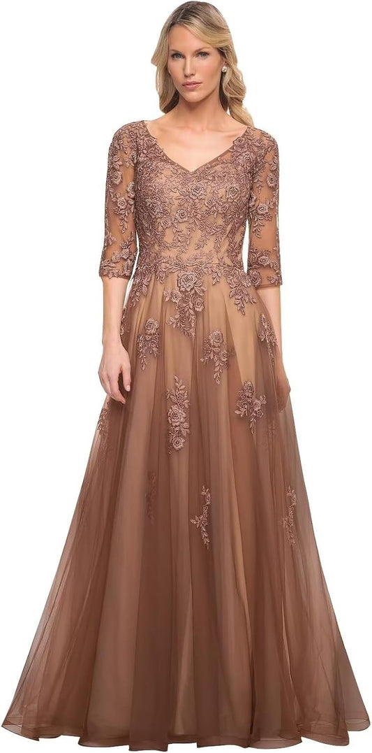 Damen V-Ausschnitt 3/4 Ärmel Kleid für die Brautmutter A-Linie Tüll Spitzenapplikationen Langes formelles Partykleid QA117