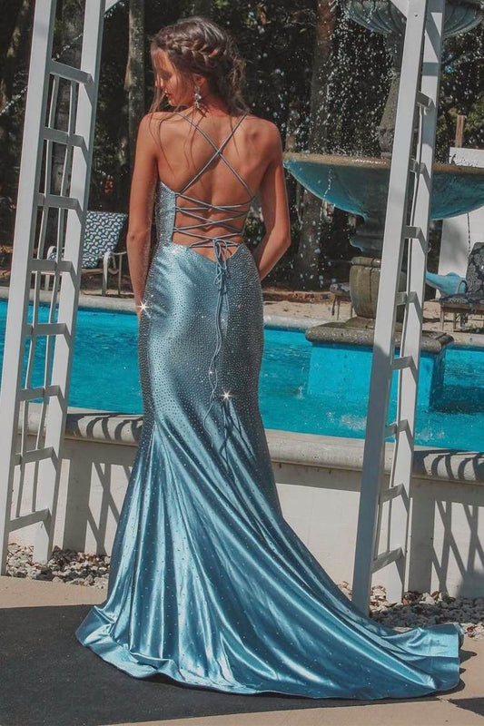 Rückenfreies, himmelblaues, langes Ballkleid im Meerjungfrauen-Stil