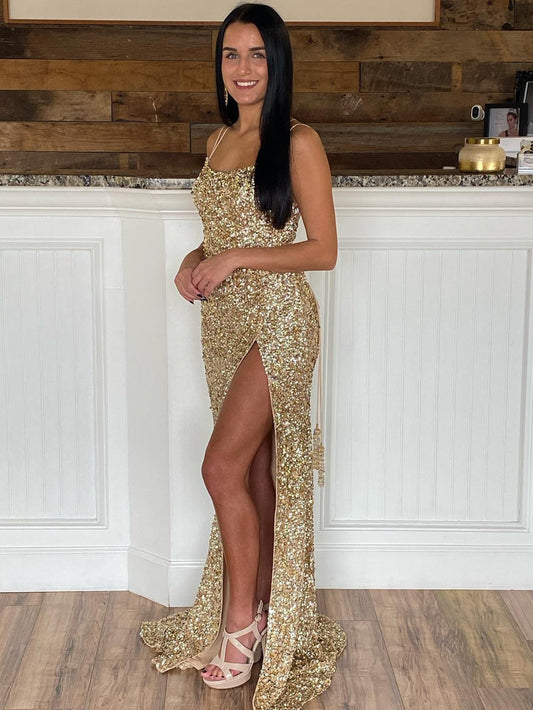 Mermaid Spaghetti Straps Long Sequins Prom Dress