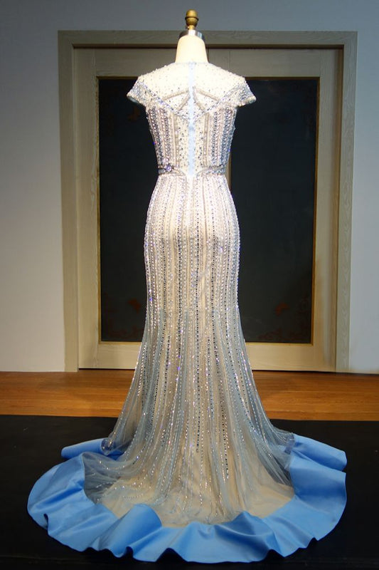 Cap Sleeves Floor Length Mermaid Beading Prom Dresses with Crystals