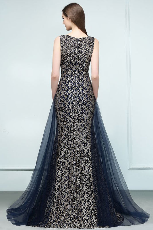 Floor Length Gold Mermaid Sleevless Crew Lace Prom Dresses