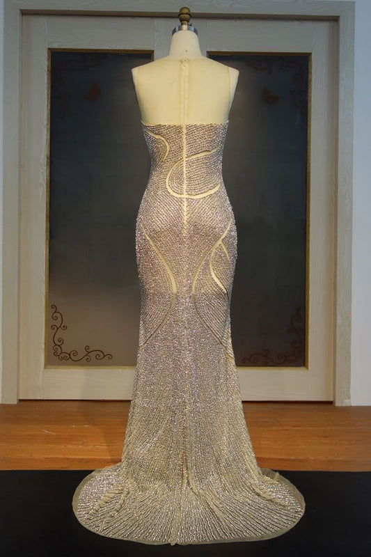 Long Spaghetti Mermaid Sweetheart Champagne Sequined Prom Dresses