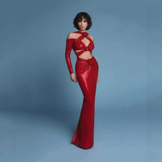 Hollow Out Sequin Deep V Maxi Prom Dress