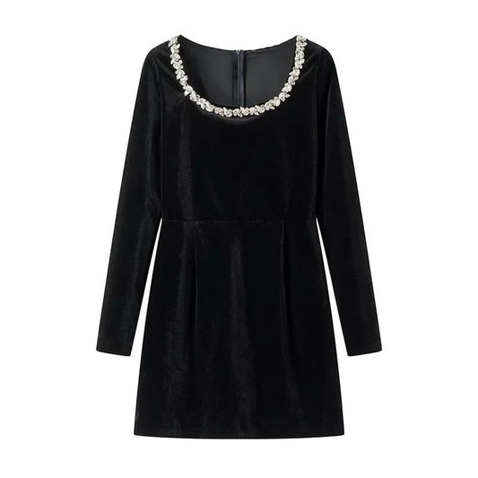 TARUXY Bead Drill Velveteen Dress For Women Long Sleeve Slim Black Formal Dress Female Party Elegant Retro Evening Dresses Femme