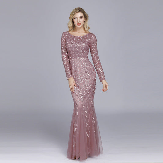 Spring Multi-Color Long Sleeve round Neck Fishtail Banquet Evening Dress for Women