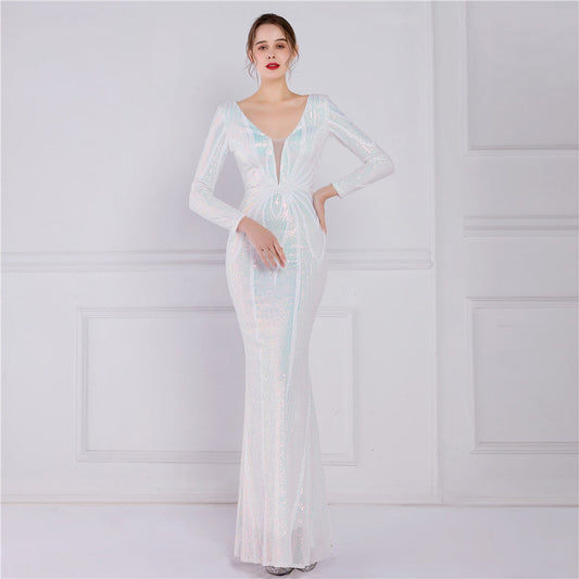 Summer Autumn Banquet Host Slim Mesh Sequ Evening Dress Fishtail Dress for Women